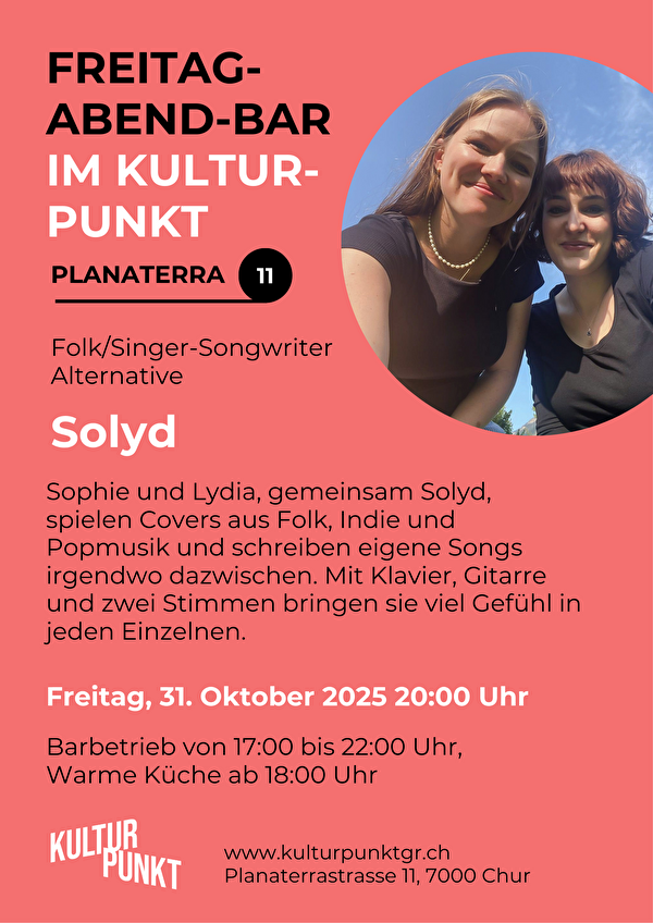 Sophie und Lydia, gemeinsam Solyd, spielen Covers aus Folk, Indie und Popmusik und schreiben eigene Songs irgendwo dazwischen. Mit Klavier, Gitarre und zwei Stimmen bringen sie viel Gefühl in jeden Einzelnen.