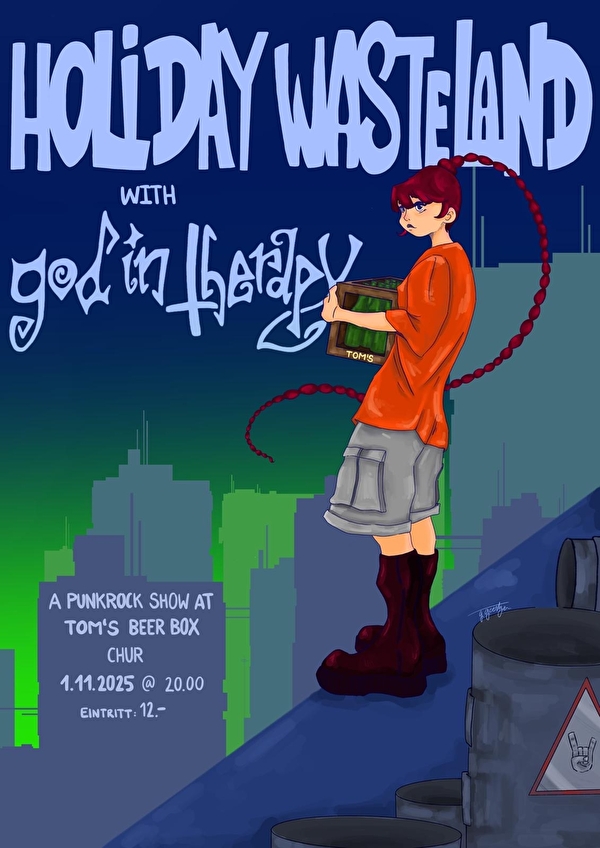 Gott muss in Therapie. Das Weltgeschehen macht ihr Angst: überflutete Städte und brennende Wälder, soziale Ungerechtigkeiten, die noch längst nicht überwunden sind und das unabwendbare Gefühl, dass die Menschheit mit 150km/h auf eine Betonwand zurast. Sie macht sich grosse Sorgen um ihren eigenen kleinen Spielplatz und vermisst die Dinosaurier so sehr. Willst du wissen, wie eine Therapiesitzung mit Gott klingt? God in Therapy ist ein Bandprojekt von vier Mitbewohner*innen, die sich nicht nur Bad und Küche, sondern auch die Bühne teilen. Auf unserem Debut Album "Strange Thing", welches im Dezember 2024 erschienen ist, wechseln sich Lieder zum Mitsingen mit solchen zum Abtanzen oder Abtauchen ab. Unsere Musik ist energetisch, ehrlich und vielseitig. Wir erzählen von Frustration, Weltschmerz und halt doch auch noch vom Schönen, das es auf der Welt gibt.
